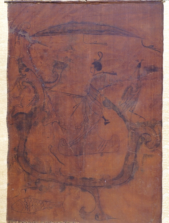 这幅人物御龙帛画,作于战国,我们先祖对生命奥妙的探寻,就幻化在这浪漫的图景中:生死之间,应御龙而行。画中男子,眼神坚毅,着华服,佩重剑,缰绳另一端,紧紧拴着一条巨龙。巨龙昂首翘尾,身呈龙舟,舟尾立鹤(凤),舟旁还有一“锦鲤”随行,一众乘风破浪,直抵永生。