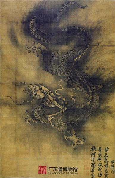 这是中国美术史上的画龙杰作。画家用粗劲的线条勾画龙身并以淡墨晕染,仅在龙的眼睛及爪处施有赭色。画面右下“骑元气,游太空”等字样,与盘旋矫健、须目贲张的飞龙呼应,将飞龙腾跃九天、叱咤风云、势震山河的磅礴气势呈现得淋漓尽致。