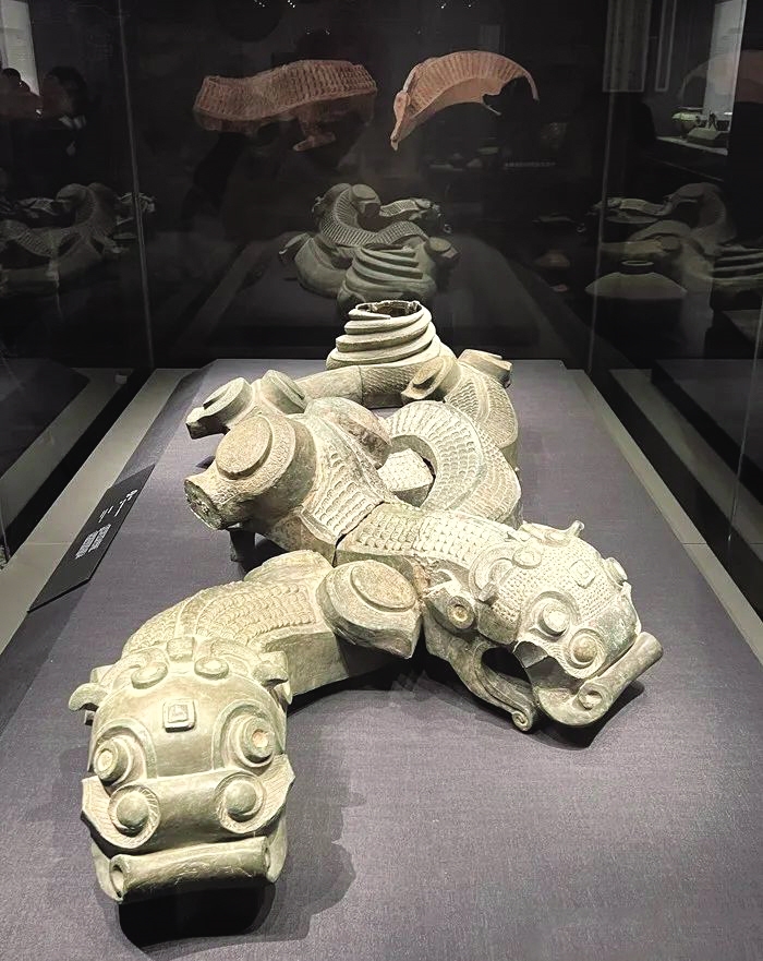 这是自秦而来的双龙,呼啸、交缠、蛰伏,极有气势!长2.3米,重75千克,龙头略呈方形,身饰鱼鳞纹,龙体中空,合铸焊接而成。它或许是盛大祭祀时的礼器,或许是巍峨建筑的装饰构件,或许是巨型乐器的底座,坎坷身世,不改其威严,残缺身躯,掩不住气吞山河的霸气。