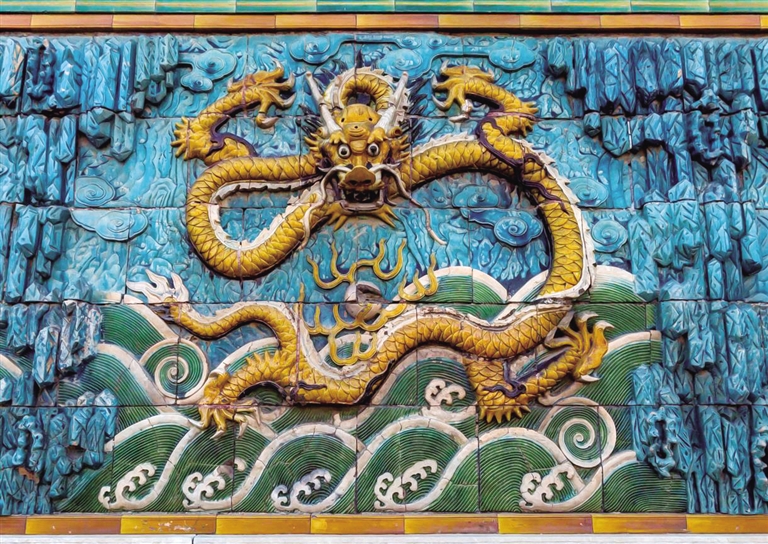 如果你去参观故宫的珍宝馆,很难不注意到如此大气绚烂的琉璃影壁!壁长29.4米,高3.5米,壁上蟠龙以高浮雕手法制成,纵贯壁心的山崖奇石,将9条龙分隔于5个空间,有逐火戏珠的,有龙尾前甩的,有前爪击浪的,有腾挪跳跃的……均似破壁而出,真真巧夺天工!诸多迎合“九”“五”之数的设计,充分强调着“九五之尊”这一身份,着实体现了乾隆皇帝的皇权与审美。紫禁城内的九龙壁,与山西大同九龙壁、北京北海公园九龙壁,合称“中国三大九龙壁”。
