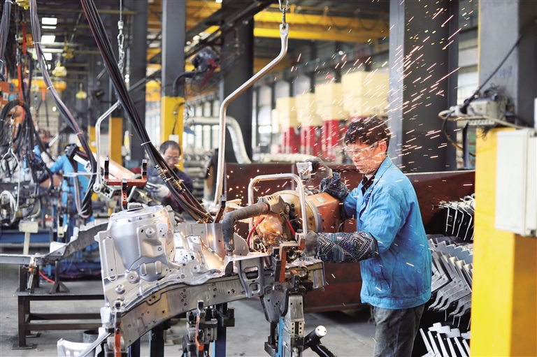 安徽省合肥市肥西县桃花镇一家机械企业生产车间,工人在生产汽车零配件。