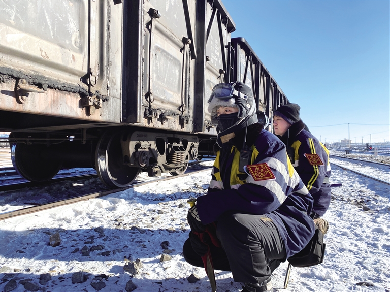 寇永强是准轨车间的一名工长,在这里工作11年了,也是班组里年龄最大的检车员,如今已是经验丰富的“老师傅”。他说,二连运用车间的艰苦,体现在当地严苛的自然环境和口岸城市繁忙的作业压力两方面。检车员们要在冬季零下40摄氏度的天气中,连续户外工作,保障每一辆进入作业场的列车准时完成检车。“列检不仅是技术活,还是体力活。我们平均每年穿坏4双绝缘鞋,每天在铁路线上要往返四五公里。”寇永强这样总结检车员的工作,就好比货车的“签证官”,只有检查合格、确认安全,才能放行列车前往下一站。“到二连的11年,我几乎没在家过春节。今年春节,也是二连口岸货运最繁忙的时候,我和工友们坚守在工作岗位,保障铁路运行安全。”寇永强说。
