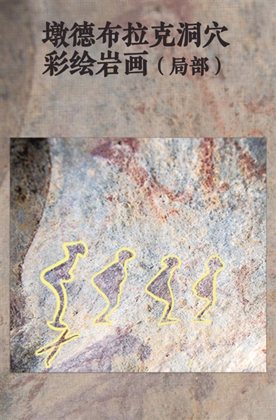 这是位于新疆阿勒泰市汗德尕特乡的墩德布拉克洞穴彩绘岩画(如图4)。新疆阿勒泰地区文博院馆员卓娅·巴合提介绍,这面岩画直观地呈现了先民使用雪踏(或为滑雪板前身)滑雪狩猎的真实画面。岩画中的人物弯腰屈膝,抬头撅臀,脚蹬短小雪踏,动作与现代滑雪动作基本相同。
