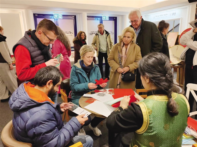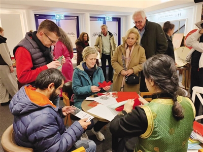 非遗刺绣、剪纸、树皮画等吸引众多当地民众参与,与非遗传承人互动。在演出场地进行非遗展,引人入胜,现场为观众讲解非遗技艺,传播非遗文化。