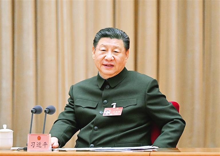 3月7日下午,中共中央总书记、国家主席、中央军委主席习近平出席十四届全国人大二次会议解放军和武警部队代表团全体会议并发表重要讲话。 摄影/新华社记者 李 刚