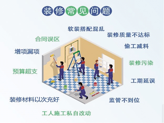 据呼和浩特市室内装饰协会会长于俊梅介绍,近年来装修投诉热点主要体现在:装修工期延误,如经营者不按合同约定时间交付家具产品或不按约定时间施工;全屋定制家具货不对板,如家具成品的尺寸、款式、颜色与合同约定和设计图不符;家装材料以次充好,以普通材料冒充环保材料,如宣称家装材料为“欧标”,但实际并无相关具体标准;家具建材卖场以约定或单方声明排除法定责任,如卖场内商家跑路,卖场以消费者未直接与其签订购买合同为由,拒绝承担柜台出租者义务。