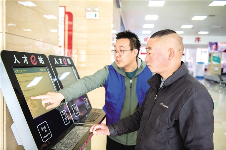 3月18日,求职者在呼和浩特市玉泉区零工市场通过务工信息平台查看实时滚动更新的用工信息。近年来,呼和浩特市玉泉区持续推进公共就业服务体系建设,大力发展公益性零工市场,以线上线下相结合的方式,为零散工、临时工、短期工等人群提供信息发布、在线匹配对接、技能培训、权益保障等服务,有效促进劳动者多渠道灵活就业。