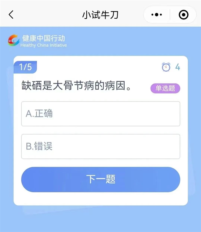 每次随机抽取5道题,不限时。可随时、多次进入答题,次数不限。此板块可为答题者提供更多练习机会,通过答题机制广泛学习健康知识。