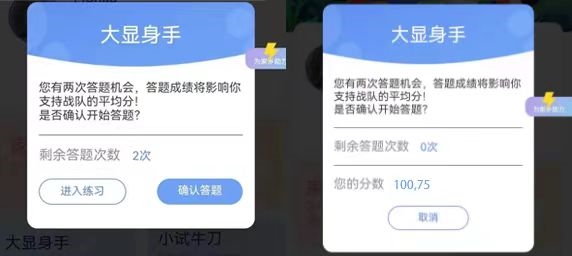 每题答题后显示正误,20题全部答完后显示本人本次得分。同时弹出提示:您的本次得分是XX分,成功为XX省助力!