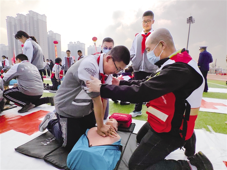 “进入火场,需要撤离时,我们可以用这个喇叭通知火场的人员进行撤离……”在操场上,消防员一边向学生讲解消防装备,一边亲自示范,大家听得津津有味。在应急救护科目演练现场,不少学生在专业人员的指导下,学习心肺复苏知识、海姆立克急救法等。中央民大附属中学呼和浩特分校高二(9)班的杨紫跃接受记者采访时说:“今天通过演练活动学习到很多急救知识,以后在生活中能够灵活运用。比如身边有人遇到异物卡住喉咙,我会用海姆立克急救法让他远离生命危险。”
