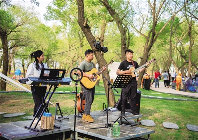 5月5日,游客们在林间自弹自唱,乐享五一假期。小长假期间,呼和浩特市玉泉区“林下空间”精心打造的萌宠乐园、水中八爪鱼、玩偶欢乐颂、烧烤音乐露营会等游乐项目,吸引许多市民和游客前来畅游、观景、看表演,参与互动体验,在优美的绿色空间里乐享休闲时光。