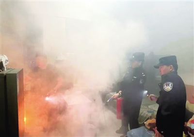 为防止火势进一步扩大,民警果断破坏店铺门锁,带着灭火器,冒着浓烟冲进店铺寻找起火点。经过十多分钟的紧急处置,明火终于被扑灭。