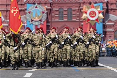 5月5日,在俄罗斯首都莫斯科,士兵列队走过红场。当日,莫斯科举行纪念卫国战争胜利79周年阅兵式彩排。据介绍,超过9000人和70件武器装备将参加5月9日胜利日红场阅兵。摄影/新华社记者 白雪骐
