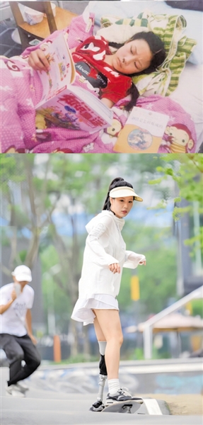图2:上图为胡月2008年汶川地震后在帐篷医院。下图为2023年6月20日,胡月在成都市锦江区轻极限运动公园练习滑板。