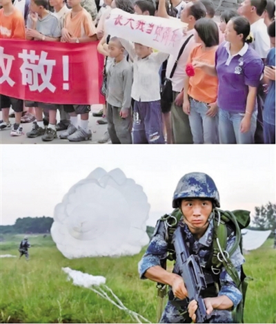就在这时,空降兵官兵打着“黄继光生前所在部队”的红旗前来救灾。空降兵救了程强,也给他心里埋下了一颗想当空降兵的种子。