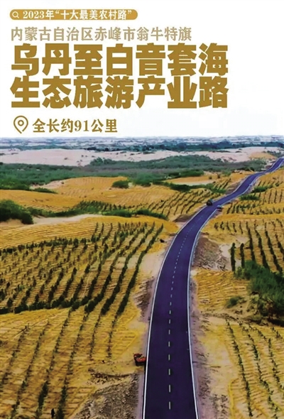 乌丹至白音套海生态旅游产业路作为通往沙地歼灭战主战场的唯一生命之路,全长91公里,总投资1.77亿元,采用三级公路标准建设,横贯科尔沁沙地,是迄今为止赤峰市规模最大、里程最长的沥青混凝土路面穿沙公路。这条公路途经4个苏木(镇),串起沿线周边的特色产业、生态农牧业、红色研学点和特色旅游资源,形成了“公路+生态+产业+旅游”等多位一体的融合发展新模式,打造了一条“产业因路而兴、农村因路而美、农民因路而富”的“绿富同兴”精品示范路,是一条实实在在的便民路、生态路、产业路、致富路、民族团结进步路。