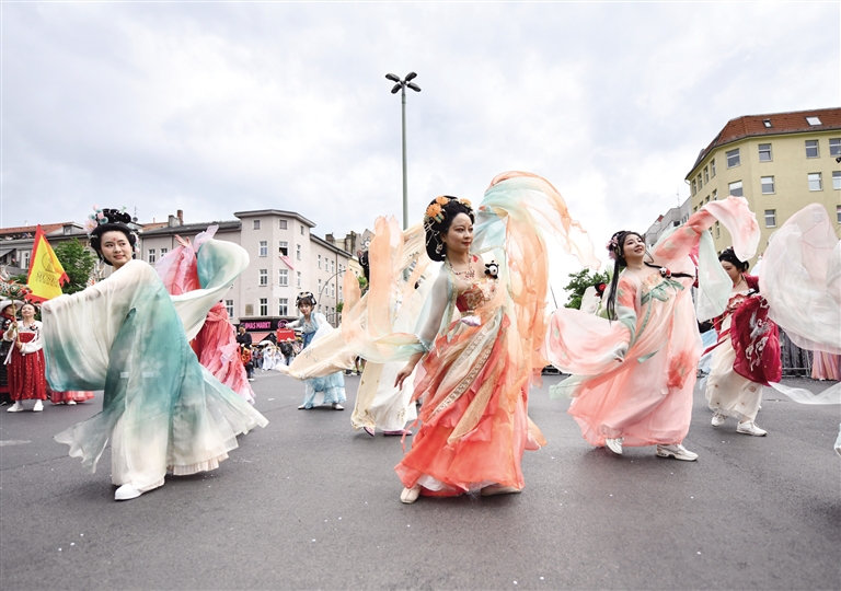 5月19日,来自中国的演员参加柏林文化狂欢节大游行。当日,2024柏林文化狂欢节大游行在德国柏林克罗伊茨贝格区举行,近60支队伍的数千名演员将游行区域变成欢乐的海洋。柏林自1996年起举办文化狂欢节,展现柏林作为世界大都市的文化丰富性。今年的柏林文化狂欢节5月17~20日举行。摄影/新华社记者 任鹏飞