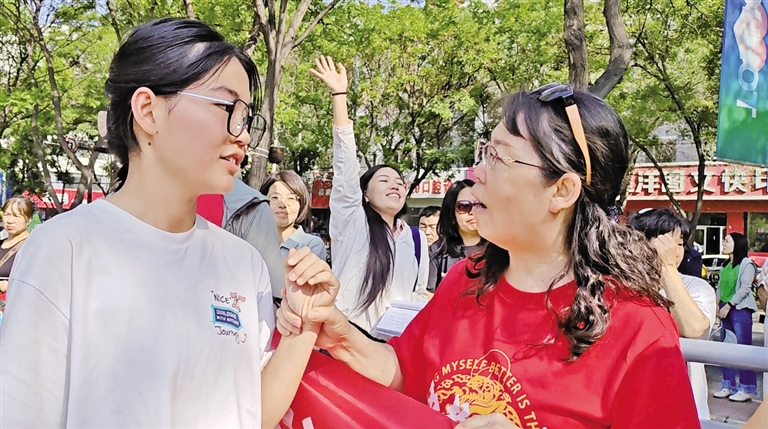 “加油!加油!”“稳住啊,别慌!”“心态一定要平和!”在呼和浩特第十八中学考点,送考老师们喊着自己学生的名字,击掌、拥抱、送上祝福。