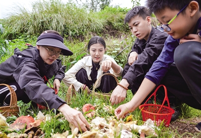 8月4日,人们在昆明市盘龙区一处山林里整理刚采摘的野生菌。正值暑期,人们来到云南体验采摘野生菌,避暑消夏。 摄影/新华社记者 王静颐