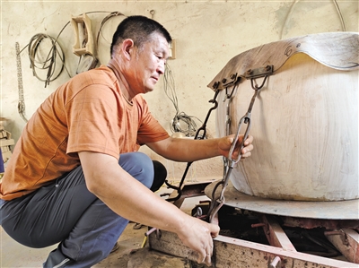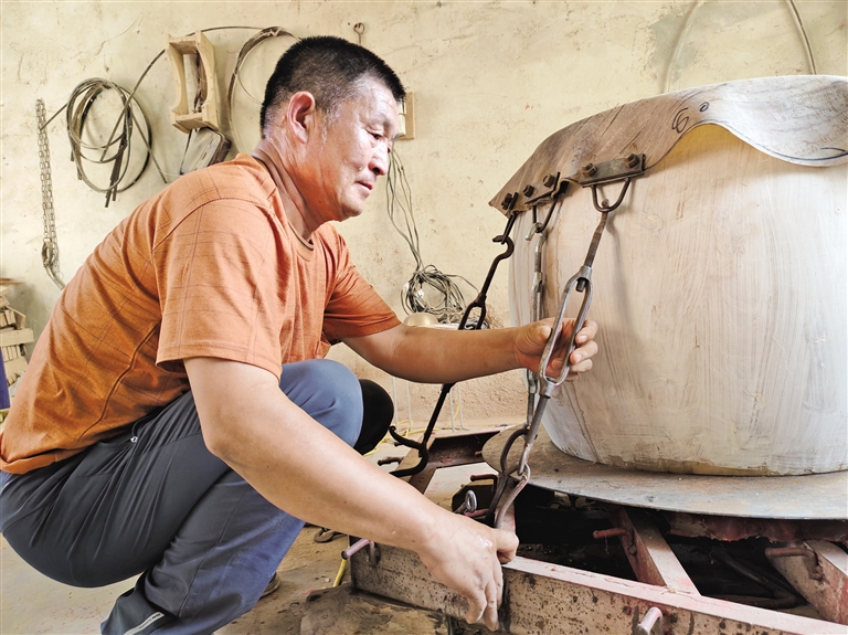 制作一面榆木大鼓需要3~4天的时间,制鼓程序主要有制作鼓腔和蒙鼓皮两大步骤,每个步骤每处细节都马虎不得。以鼓皮为例,在蒙鼓皮之前就需要做很多准备工作。先要把黄牛皮放在清水里浸泡一段时间,然后把浸泡好的皮子上的牛毛去掉,并把牛皮里的肉层戗干净,戗皮子需要反复进行三四次,才能保证鼓皮的最终质量,否则会影响鼓的声音。