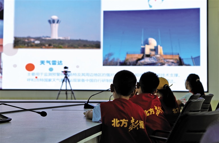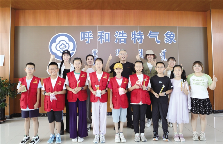 活动在有趣的互动游戏中展开。小记者们先来到赛罕区国家基本气象站参观地面观测场设备,翻斗式雨量传感器、冻土自动观测仪、风向风速仪等各种气象监测设备,让大家对气象数据来源有了初步认识。“原来这是天气预报的第一步啊!”来自胜利街小学三年级五班的于小悦说。