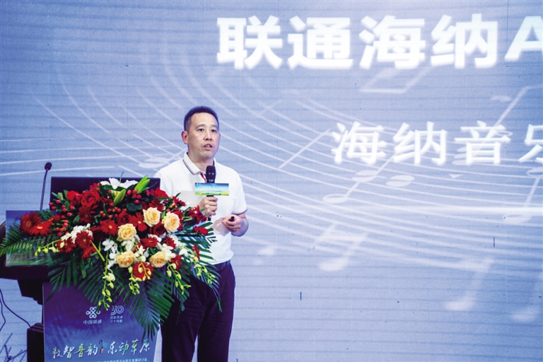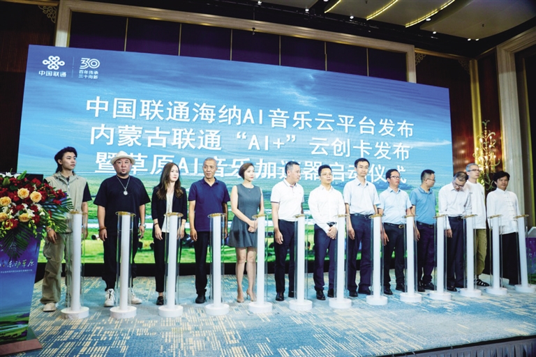 在一轮平台及产品的介绍之后,内蒙古联通党委书记、总经理耿向东,联通在线副总经理常剑,联通在线广州公司总经理李韩,内蒙古网络文艺家协会主席常慧渊,内蒙古网络文艺家协会副主席、著名歌唱演员苏勒亚其其格,沈阳音乐学院党办主任黄志江,红棉小冰副总裁申成磊,讯飞音乐副总经理江源,广州酷狗内容运营中心负责人刘洲,杭州网易云音乐内容发行总监刘晋北,Z世代原创唱作人王以诺,著名歌唱演员、蒙电乌兰牧骑艺术总监葛小虎,青年音乐人、词曲作家潘浩东上台共同见证中国联通海纳AI音乐云平台发布、内蒙古联通“AI+”云创卡发布暨草原AI音乐加速器启动仪式。