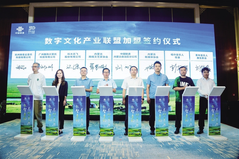 随后,内蒙古联通党委委员、副总经理刘向阳,内蒙古网络文艺家协会主席常慧渊,内蒙古新媒体协会会长范泊辰以及讯飞音乐、酷狗音乐、网易云音乐的音乐平台方代表,唱作音乐人、导演彭志强,青年音乐人、叁生影业总经理、导演刘佳鑫上台共同参加数字文化产业联盟签约仪式。这标志着草原AI音乐产业发展的新阶段,有效地促进了草原音乐与数字技术的深度融合。