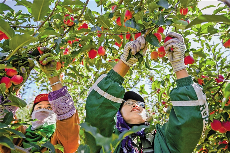 9月12日,在通辽市科尔沁左翼中旗希伯花镇希伯花嘎查,果农在采摘锦绣海棠果。眼下,通辽市科尔沁左翼中旗希伯花镇栽植的锦绣海棠果迎来丰收,田间地头一派繁忙景象。近年来,当地大力发展果树经济林,科尔沁左翼中旗锦绣海棠栽植面积已达12.6万亩,挂果面积达3万亩,盛果期亩产量达1000公斤。如今,以锦绣海棠为代表的经济林已成规模,其防风固沙、水土保持等生态效益逐渐显现,农牧民来自经济林的收入也不断增长。摄影/新华社记者 连 振