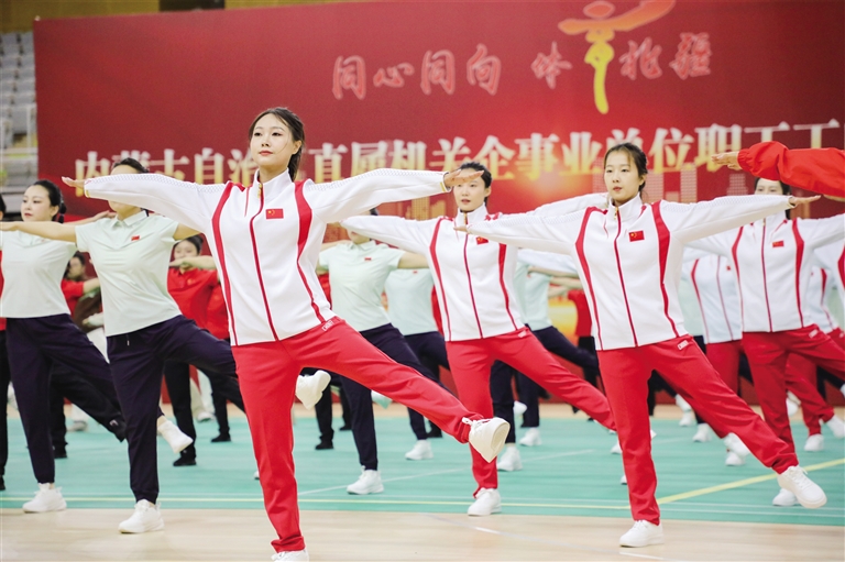 9月30日,“同心同向 体育北疆”内蒙古自治区直属机关企事业单位职工工间操比赛开幕,共计20支代表队400余名运动员参赛。本次比赛共设置第九套广播体操展演和健身操自编套路团体赛两个项目。随着音乐响起,职工工间操展演正式开始,整齐划一的动作、铿锵有力的节奏,展现了职工们良好的身体素质和积极向上的精神风貌。