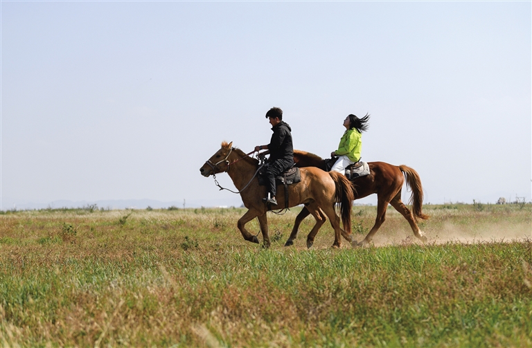 假期期间,鄂尔多斯草原旅游区丰富多彩的文旅活动吸引着众多游客前来。游客们观看国庆特别版实景马术剧《英雄》,骑马漫步草原,感受大自然美景,品尝地道的内蒙古美食。