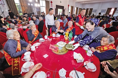 10月9日,在河西埭村“孝心村宴”活动现场,村嫂志愿者给老人端上长寿面。当日,浙江省杭州市临平区文化特派员走亲启动仪式暨塘栖镇河西埭村迎重阳孝心节“孝心村宴”活动在河西埭村文化礼堂举行。村里200多位70周岁以上的老人齐聚一堂,活动现场还有志愿者提供义务理发、量血压等便民服务。