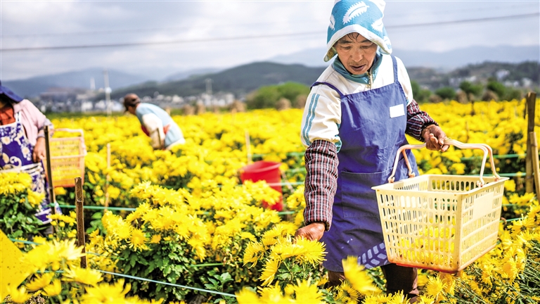 10月19日,当地村民在大湾镇菊花种植基地采摘金凤菊。金秋时节,贵州省六盘水市钟山区大湾镇种植的300余亩金凤菊喜获丰收,田间地头一派繁忙景象。近年来,当地采取“公司+基地+农户”的形式发展菊花种植加工产业,以土地流转、用工等形式带动周边群众就业增收。 摄影/新华社记者 陶 亮