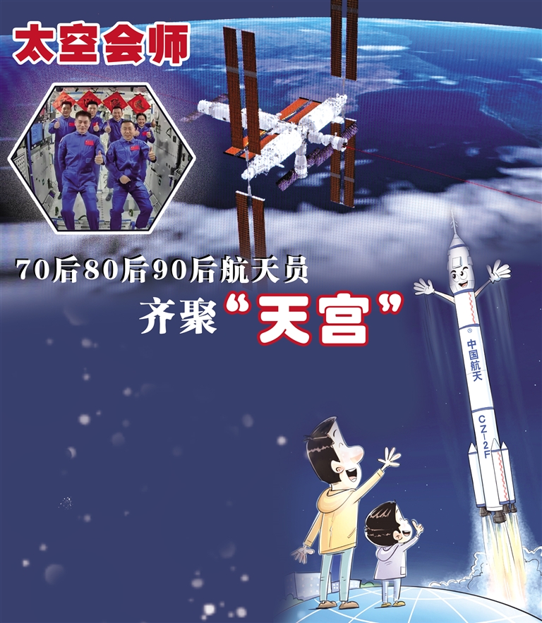 在载人飞船与空间站组合体成功实现自主快速交会对接后,神舟十九号航天员乘组从飞船返回舱进入轨道舱。10月30日12时51分,在轨执行任务的神舟十八号航天员乘组顺利打开“家门”,欢迎远道而来的神舟十九号航天员乘组入驻中国空间站,70后、80后、90后航天员齐聚“天宫”,完成中国航天史上第5次“太空会师”。随后,两个航天员乘组拍下“全家福”,共同向牵挂他们的全国人民报平安。