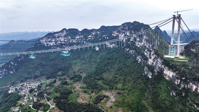2022年开工建设的花江峡谷大桥,因跨越被誉为“地球裂缝”的花江大峡谷而得名,是贵州省六枝至安龙高速公路的控制性工程。全长2890米的大桥为钢桁梁悬索桥,桥面距水面垂直高度625米,建成后将成为新的世界第一高桥。(向定杰)