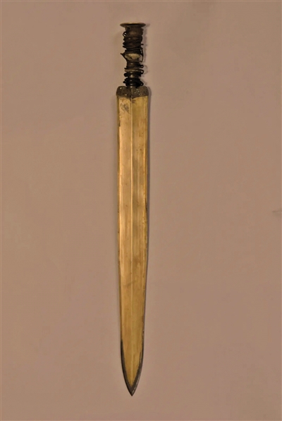 剑乃短兵之祖,近搏之器。因其携之轻便,佩之神采,用之迅捷,素有“百刃之君”之美称。一名优秀的剑客需要把剑深藏在怀中,隐忍等待,当足够靠近敌人的瞬间,突然出击,刺出那决定胜负的一剑。另外,地形以丘陵、盆地为主的吴越地区,战争主要依靠水兵和步兵“短兵相接”,这些或是“剑”在春秋战国时期格外盛行的原因。此间,吴越兵器锋利无比盛誉天下。这把战国越王者旨於睗剑蕴含越国匠师们首创的复合铸造技术,剑身中脊及两从由不同成分之青铜嵌铸而成。剑身中脊硬度低而韧性高,剑不易折断;两从硬度高,可提高实战时的杀伤力,并保持不锈不蚀。剑柄根据使用习惯设置铜箍,为剑的使用者提供了极好的握持体验,再缠上丝质的缠缑[gōu]以防打滑。这2400多年前的“人体工学设计”令人感叹。