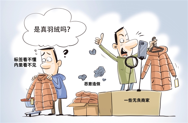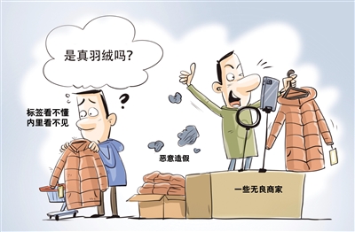 从部分消费者投诉举报看,有的无良商家以飞丝、粉碎毛等混合物代替羽绒。有的短斤少两,比如标注绒子含量90%,实际连50%都不到;有的恶意造假,用蓬松棉、聚酯纤维等填充。