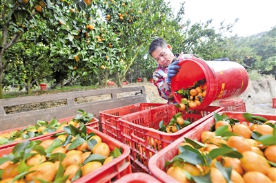 12月18日,在柳州市柳江区土博镇四案村,村民在采收砂糖橘。日前,广西壮族自治区柳州市柳江区土博镇农民深入果园和菜园,积极开展管护、采收等工作,冬日田园呈现一派生机勃勃的景象。摄影/新华社记者 黄孝邦