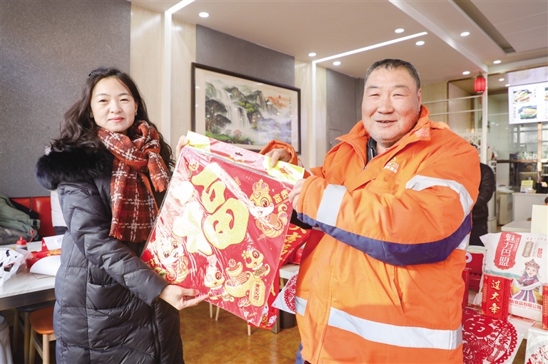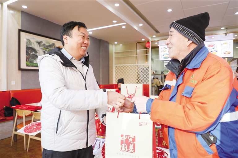 “我从昨天就开始准备,今天10点炖骨头、烩菜,希望大家吃得高兴,吃得好。”削面店老板孙军对记者说,环卫工人们每天为城市的整洁干净忙碌,过年也坚守岗位,他希望这顿饭,让大家感受到尊重和关爱。