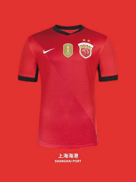 上赛季联赛和足协杯赛双料冠军上海海港队的新款主场球衣依然以红色作为主色调,不过与以往的版本相比,今年的球衣在领子下方增加了一枚金色的盾牌。据了解,这个特别的配饰是冠军队伍的象征。金色的盾牌中间,还有一个以中超冠军奖杯——火神杯为设计灵感的徽章,下方则标有夺冠年份,算得上中超历史上第一件拥有“冠军配置”的球衣。