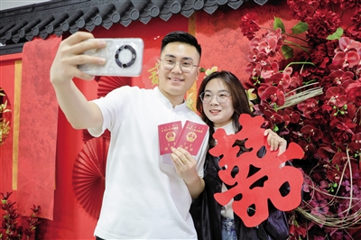 2月14日,领取结婚证的两位市民拍照留念。据了解,呼和浩特市新城区婚姻登记服务中心打造集婚姻登记、文化交流、家风教育等为一体的婚姻服务综合体,推动文明婚俗新风吹进千家万户。该中心还特意布置中式、蒙式、西式风格的打卡点,让新人们留下幸福美丽的记忆。