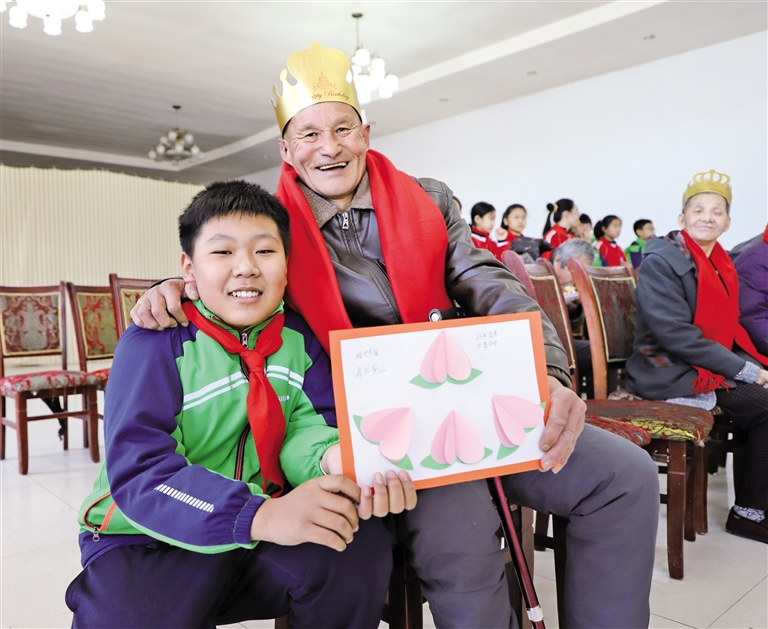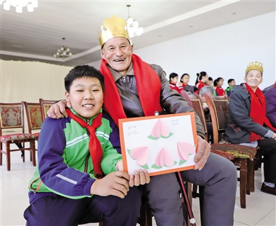 2月16日,呼和浩特市敬松老年公寓传出一阵阵欢声笑语,一群鲜艳的“红领巾”和20位老人欢聚一堂,为他们戴上暖暖的红围巾,送祝福切蛋糕,围着老人跳舞唱歌说段子。老人在孩子们的祝福声中许愿吃蛋糕,开心得合不拢嘴。