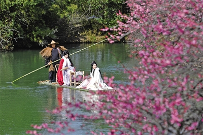 2月18日,汉服爱好者在西溪湿地乘坐竹筏赏梅。春意渐浓,杭州西溪国家湿地公园里的梅花竞相绽放,美轮美奂。西溪湿地已迎来最佳赏梅时期。西溪湿地梅花品种繁多,种植总量超过2.5万株。摄影/新华社记者 黄宗治