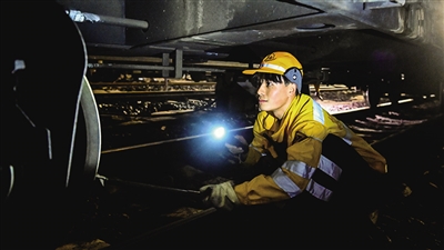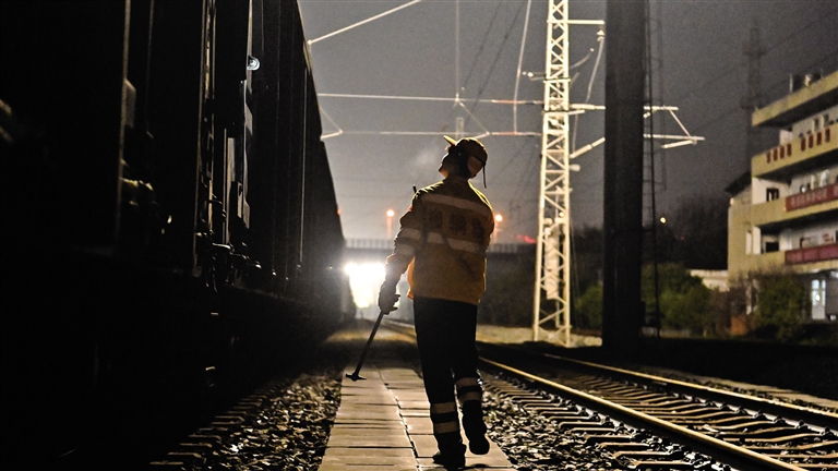 2月19日,在柳州南编组站,检车员在巡检列车车体。春运接近尾声,中国铁路南宁局集团有限公司多部门联动积极开展巡查,检修设备,及时消除安全隐患,站好春运末班岗。摄影/新华社记者 张爱林