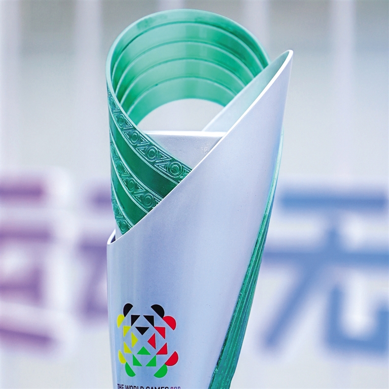 火炬的颜色以绿色和银色为主。绿色代表世界的底色,成都世运会践行绿色低碳理念,公园城市推窗见绿,与世运项目活力场景自然融洽;银色则象征科技与创新、速度与动力。火炬整体象征着中国时时逐“绿”而行、处处向“新”发力,与世界共赴未来。