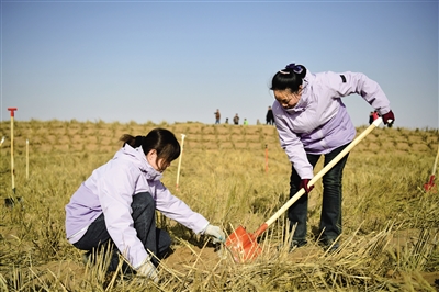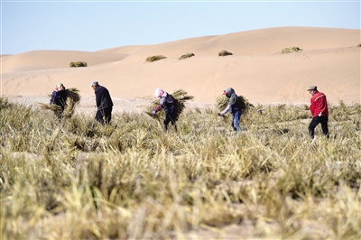 当日上午,在巴丹吉林、腾格里两大沙漠交汇处的阿拉善盟阿拉善右旗九棵树项目区,工人们有的在起伏的沙丘上铺稻草、压沙障,有的操作小型压沙机压草方格。阿拉善右旗林业草原和荒漠防治局总工程师张有拥说:“我们利用压沙机压沙障,就像在沙地里‘插秧’,将铺在沙地上的稻草精准‘植’入沙地里,作业速度比纯人工压沙障提高3倍多。”