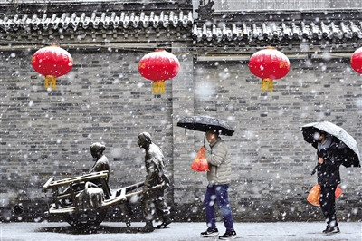 3月2日,游客冒雪在山东省青州古城景区游玩。受寒潮影响,3月2日起,山东大部分地区出现雨雪降温天气。 (据新华社报道)