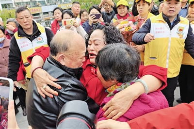 15日9时,在扬州市高邮市新时代文明实践中心,数十位志愿者敲锣打鼓欢迎“国家的孩子”杨阿娟回到家乡,高邮市阳光志愿者协会为她组织了一场温馨感人的认亲会。