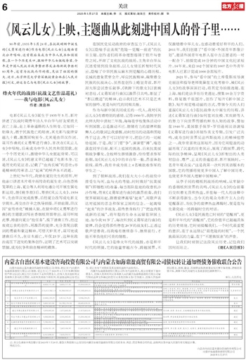 电影《风云儿女》诞生于1935年5月。影片讲述了抗战时期青年诗人辛白华与好友梁质夫流亡上海,走上革命道路的人生转变。它如同一炬烽火,燃于民族危亡的暗夜,其光影与旋律穿越九十载,激荡回响至今。尤其是由田汉作词、聂耳作曲的《义勇军进行曲》,首次在《风云儿女》中唱响,后来成为中华人民共和国国歌,在一个个历史关口,激励中华儿女挺起脊梁。可以说,《风云儿女》的意义早已超越了电影本身。它是历史的见证者,记载了“血肉长城”的悲壮;亦是精神的传承者,让“起来”的呼声永不消逝。