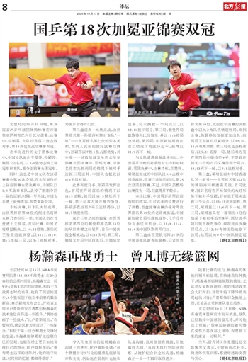 第三盘,梁靖崑面对中国香港队另一新秀——世界排名第162位的姚钧涛同样遭遇苦战。首局比赛,国乒名将在开场领先的大好形势下被对手反超,好在他于局末连救三个局点,以13:11逆转险胜。第二局,梁靖崑以11:6再下一城。第三局,梁靖崑又在一度领先4分的情况下被对手追至8平。两位选手随后展开激烈争夺,梁靖崑再次挽回局点,以12:10有惊无险地拿下该局,从而以3:0为中国队锁定冠军。(据《北京晚报》)