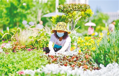 7月13日,工作人员在呼和浩特市草原丝绸之路文化公园维护、修整花境。据了解,呼和浩特市园林建设服务中心2022年在全市范围内打造19个花境,目前已全部建设完成。不同花境采取不同主题,景色错落有致,让市民们走出家门就可欣赏唯美诗意的生态花境。